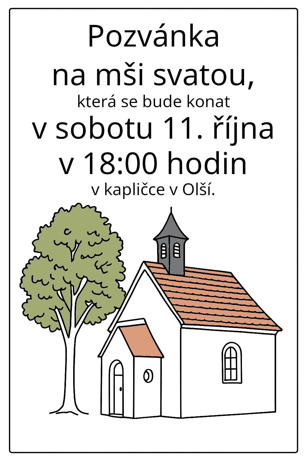 Pozvánka na mši svatou, která se bude konat v sobotu 11. října 2025 v 18 hodin v kapličce v Olší.
