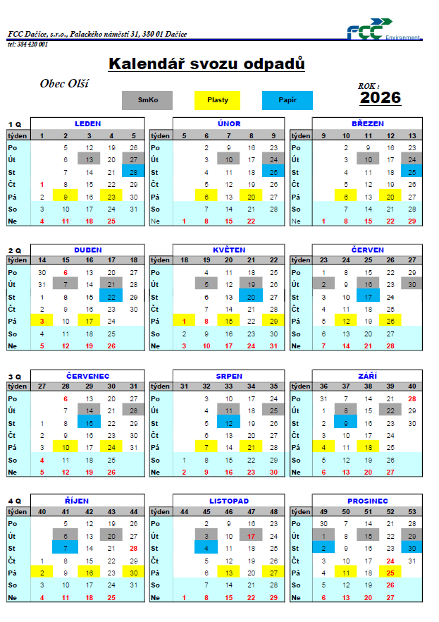 Svozy odpadů jsou označeny v následujícím kalendáři svozu odpadu.